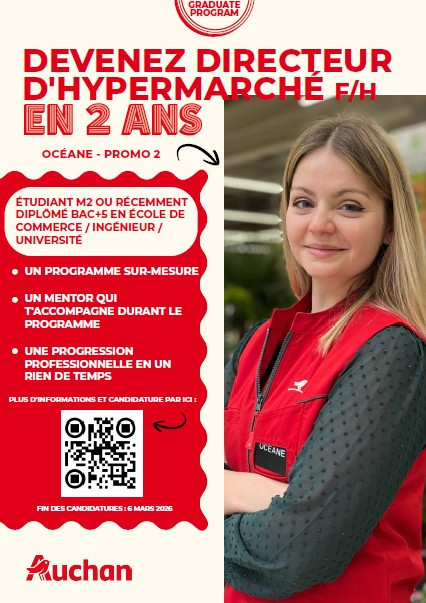Notre partenaire Auchan Retail France ouvre dès aujourd’hui sa campagne de recrutement pour la prochaine promotion de son Graduate Program, un parcours d’excellence destiné à former les futurs Directeurs d’Hypermarché.