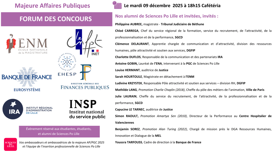 A l’initiative des ambassadeurs, ambassadrices des majeures AP, APEU et SIGR, un forum des concours pour tous les étudiants de la 1A à la 5A et étudiants en préparation aux grands concours administratifs de Sciences Po Lille se tiendra du mardi 09 décembre 2025 au 11 décembre 2025 de 18h15 à 19h45 à la cafétéria de l'Éocle.