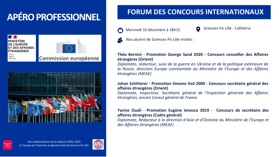 A l’initiative des ambassadeurs, ambassadrices des majeures AP, APEU et SIGR, un forum des concours pour tous les étudiants de la 1A à la 5A et étudiants en préparation aux grands concours administratifs de Sciences Po Lille se tiendra du mardi 09 décembre 2025 au 11 décembre 2025 de 18h15 à 19h45 à la cafétéria de l'Éocle.