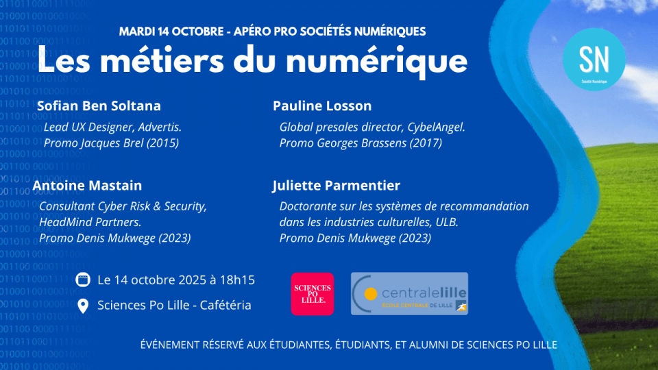 Pour répondre à cette question, l'ambassadeur et ambassadrice de la majeure Sociétés Numériques (SN), et l'équipe de l'insertion professionnelle et de l'apprentissage vous convient à un apéro pro sur les métiers du numérique le