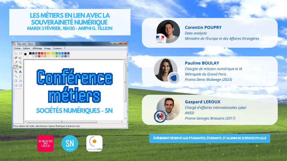 C’est dans ce cadre que l'ambassadeur et l'ambassadrice du double diplôme Sociétés Numériques entre Sciences Po Lille et Centrale Lille vous proposent une conférence métiers réunissant des professionnelles, professionnels issus des institutions publiques françaises le