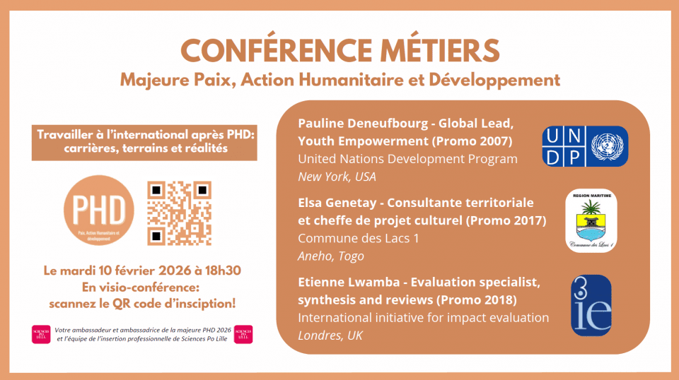 Les ambassadeurs de la majeure PHD (Paix, action Humanitaire et Développement) et l'équipe de l'insertion professionnelle et de l'apprentissage de Sciences Po Lille ont le plaisir de vous inviter à une visioconférence sur la thématique suivante : "Travailler à l’international après PHD : carrières, terrains et réalités", qui se tiendra le