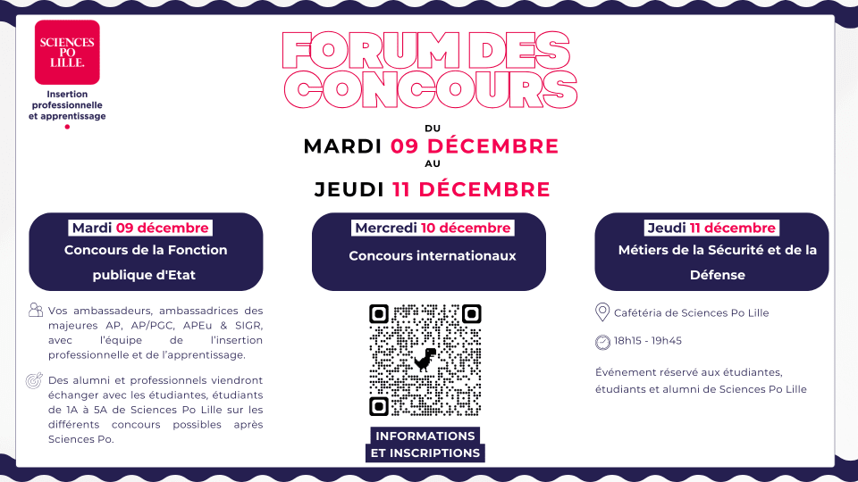 Étudiantes et étudiants de 1A à la 5A, rejoignez-nous pour découvrir, à travers les retours d’expérience d’alumni et d’invitées, invités, les concours, métiers et parcours accessibles après Sciences Po Lille.