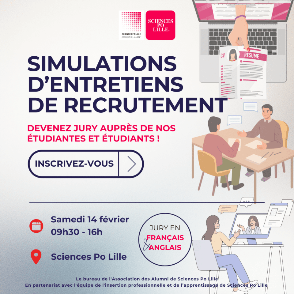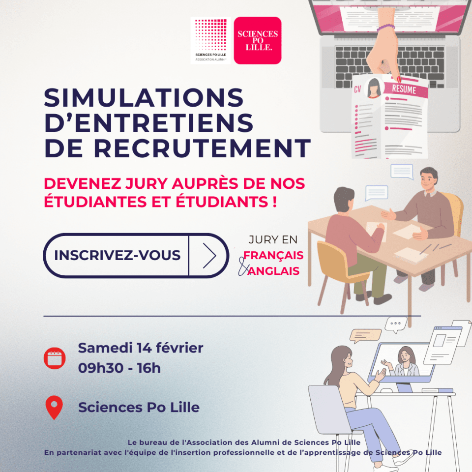 L’Association des Alumni et l'équipe de l'insertion professionnelle et de l'apprentissage de Sciences Po Lille organisent une nouvelle session de simulations d’entretiens pour accompagner les étudiantes et étudiants de Sciences Po Lille dans leur recherche de stage, d’alternance ou de premier emploi (promotion Joséphine Baker – 2025) le :
